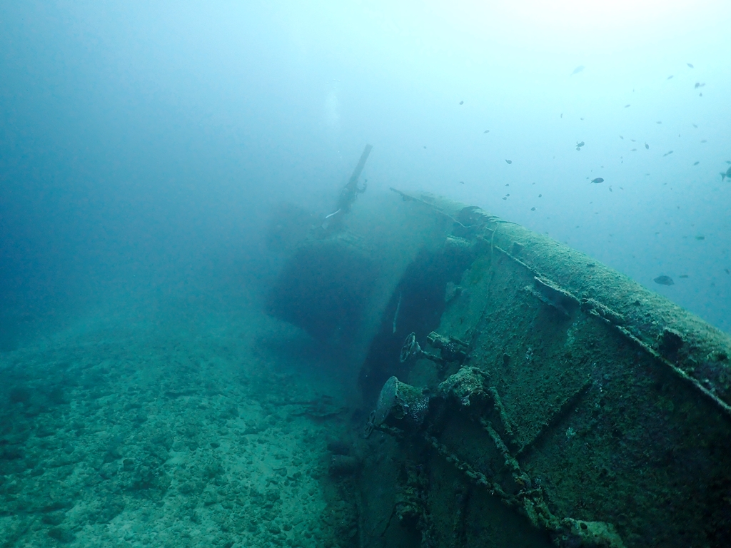 ゼロ戦の特攻で沈んだ船なので、砲台は島を向いていたり