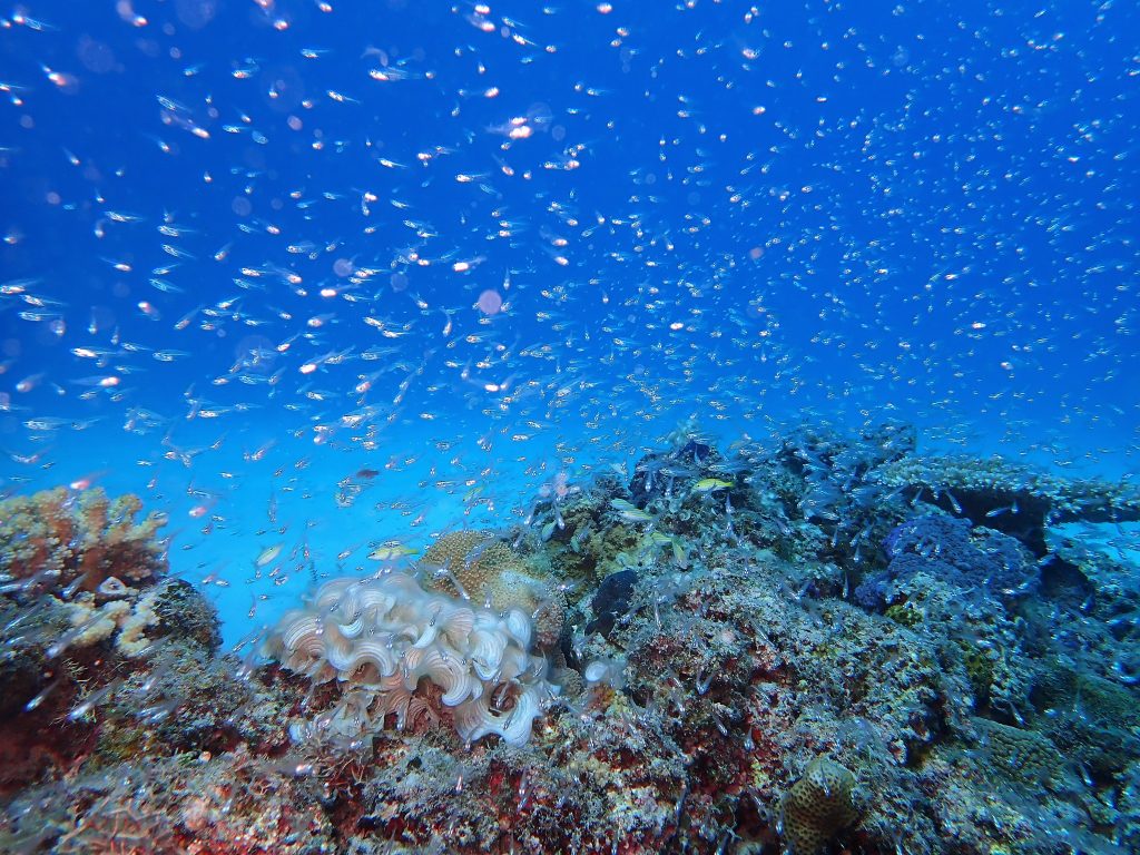 サンゴ畑の上の魚影の濃さにはダイバーさんも